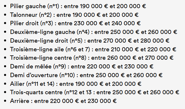 Salaires moyens par poste en Top 14. Saison 2024/2025 (source LNR) :