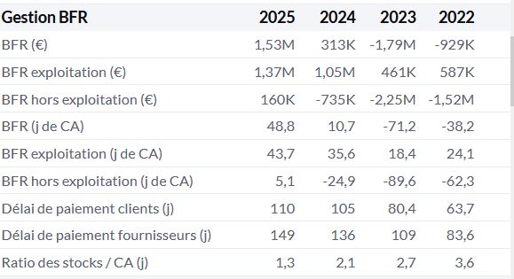 A l'interrogation pourquoi le BFR a été multiplié par 5 entre 2024 et 2025, je ne sais pas. Personnellement je regarderai plutôt le BFR d'exploitation (qui tient compte uniquement de l’activité courante) qui n'a pas beaucoup évolué.