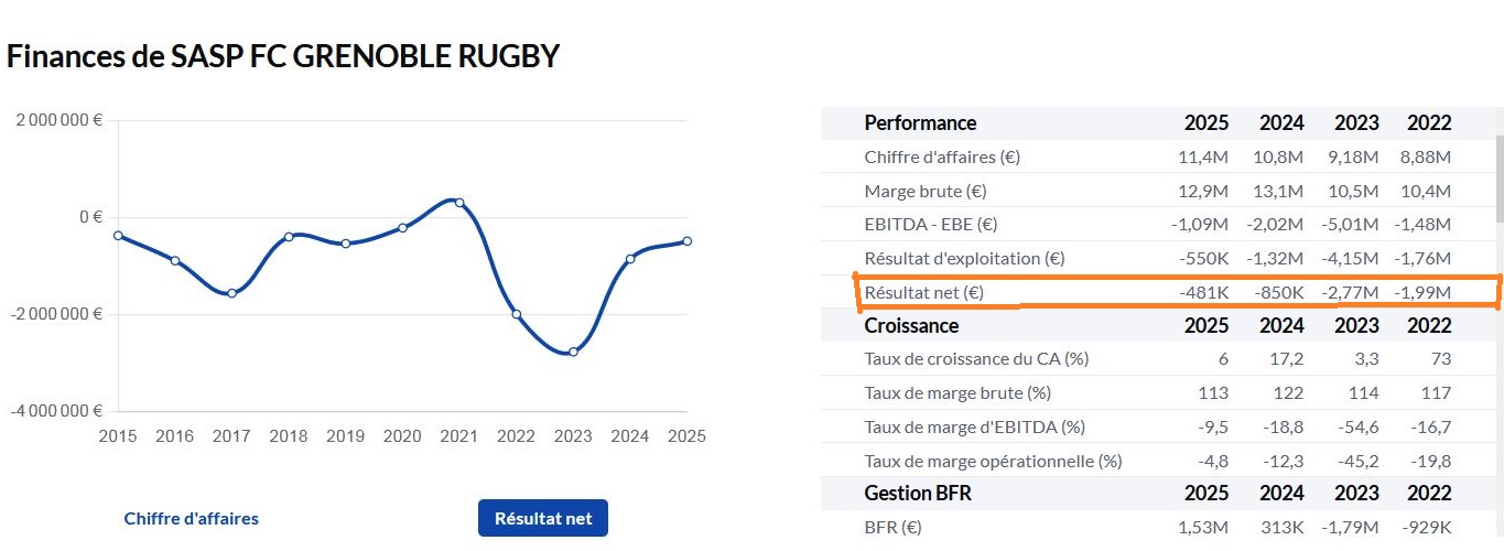 Globalement, en 2024 - 2025, le club a encore amélioré son résultat net (même s'il est toujours négatif) :