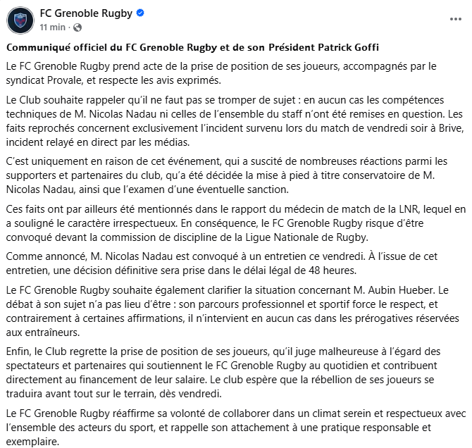 Le Club souhaite rappeler qu’il ne faut pas se tromper de sujet : en aucun cas les compétences techniques de M. Nicolas Nadau ni celles de l’ensemble du staff n’ont été remises en question. Les faits reprochés concernent exclusivement l’incident survenu lors du match de vendredi soir à Brive, incident relayé en direct par les médias.